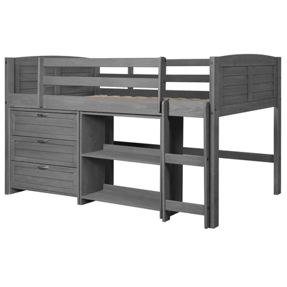 Description: The louvered low loft bed makes a small room fun, with large under bed area for storage or play. The louvered design is timeless and can make a room easy to decorate and give it a warm inviting look. The 3-drawer chest adds storage under the louvered low loft bed. The smaller bookcase adds additional underbed storage.